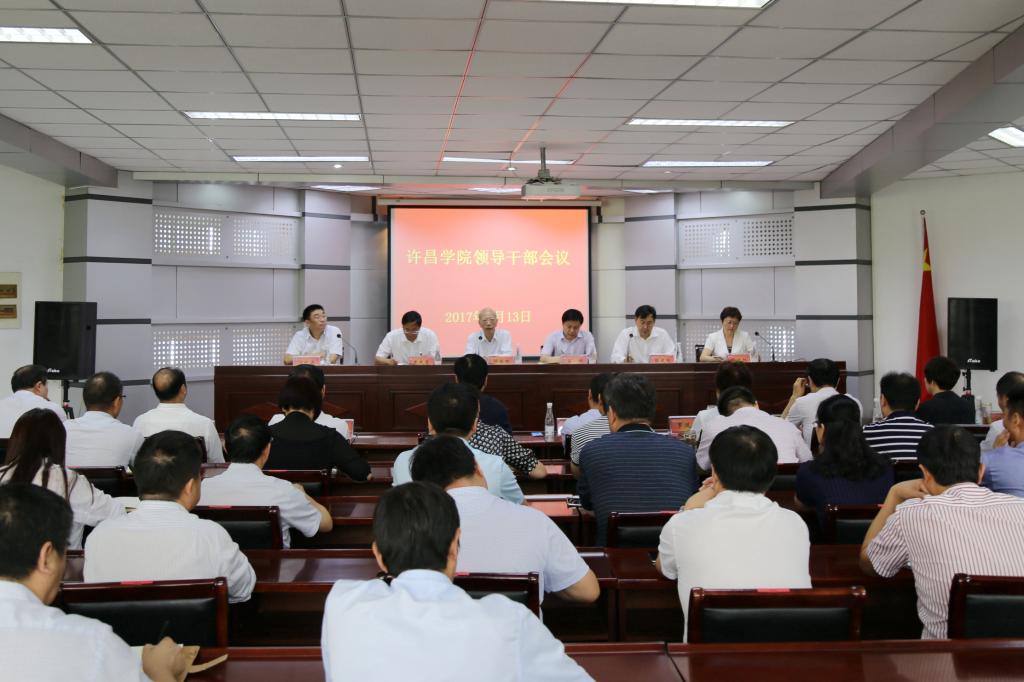 9月13日上午,学校在办公楼第三会议室召开全校领导干部会议,宣布中共河南省委关于我校主要领导调整的决定。省委组织部副部长修振环,省委高校工委组干处副处长宋辉,许昌市委常委、组织部长史战芳,我校校级领导干部、全校中层正职和主持工作的副职领导干部与会。