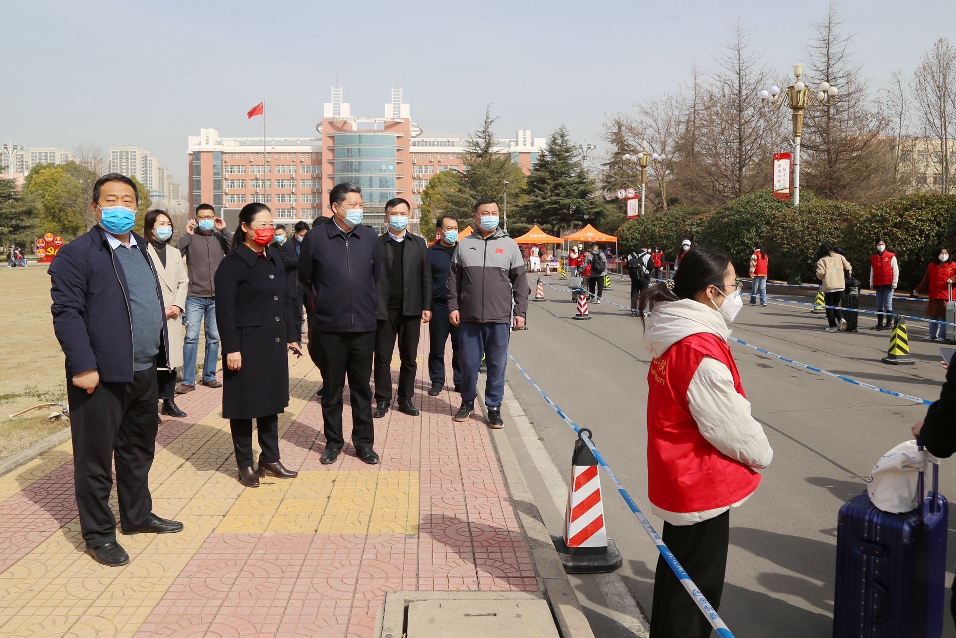 院长岳修峰,副院长高金星、潘春彩带领学校疫情防控各专班负责同志,来到学校北大门和南大门的返校入口、宿舍、餐厅等场所,实地查看并指导学生返校报到、疫情防控及服务保障工作,慰问返校学子和工作人员。校领导与师生们亲切交流,详细询问大家的工作开展情况、身体状况和返校途中情况等。