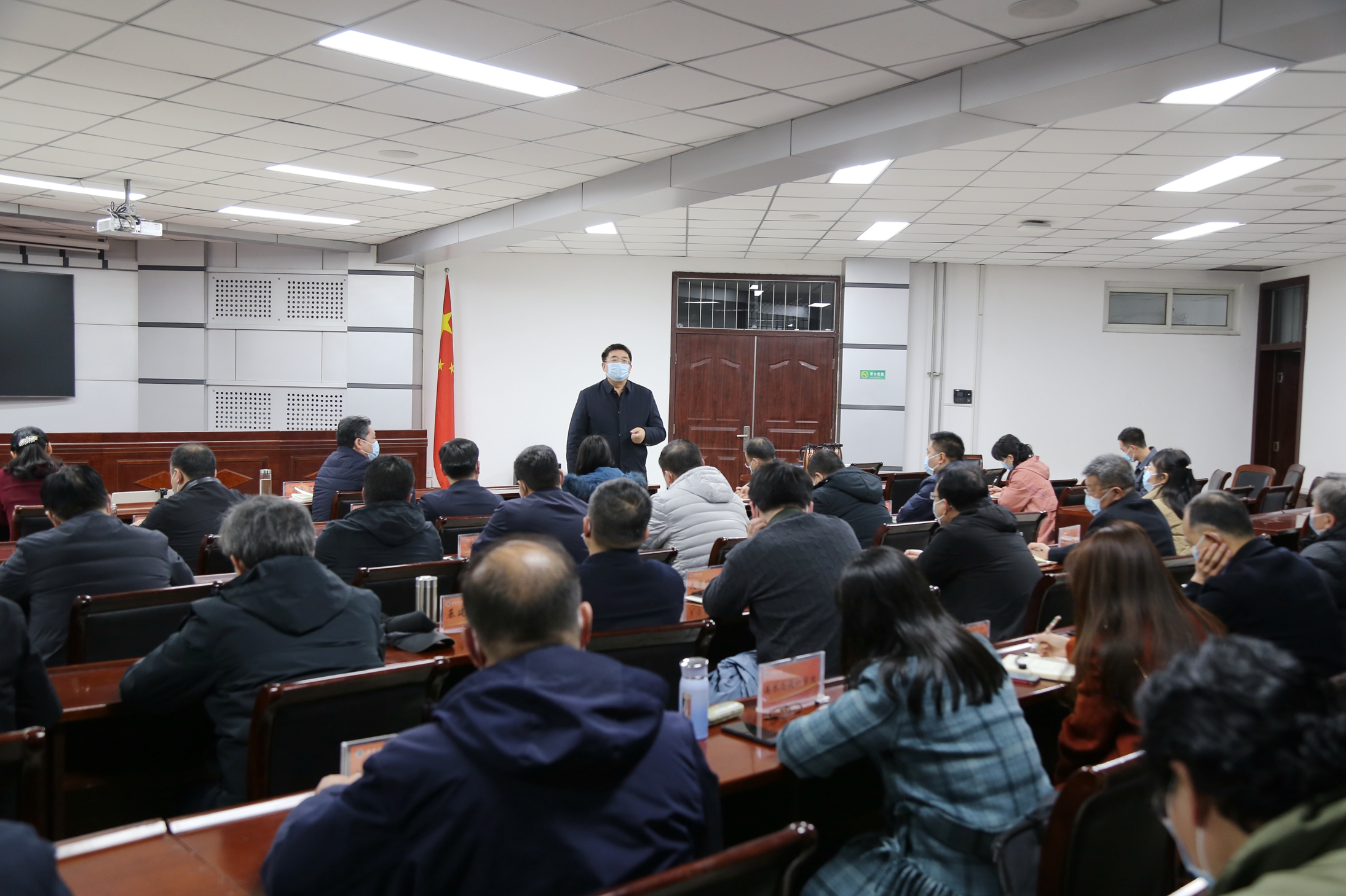 学校疫情防控指挥部办公室主任、副院长高金星传达了当天上午省委教育工委来校督导检查疫情防控工作情况和存在的问题,并就师生规范佩戴口罩等具体工作提出明确要求。(摄影:杨哲)