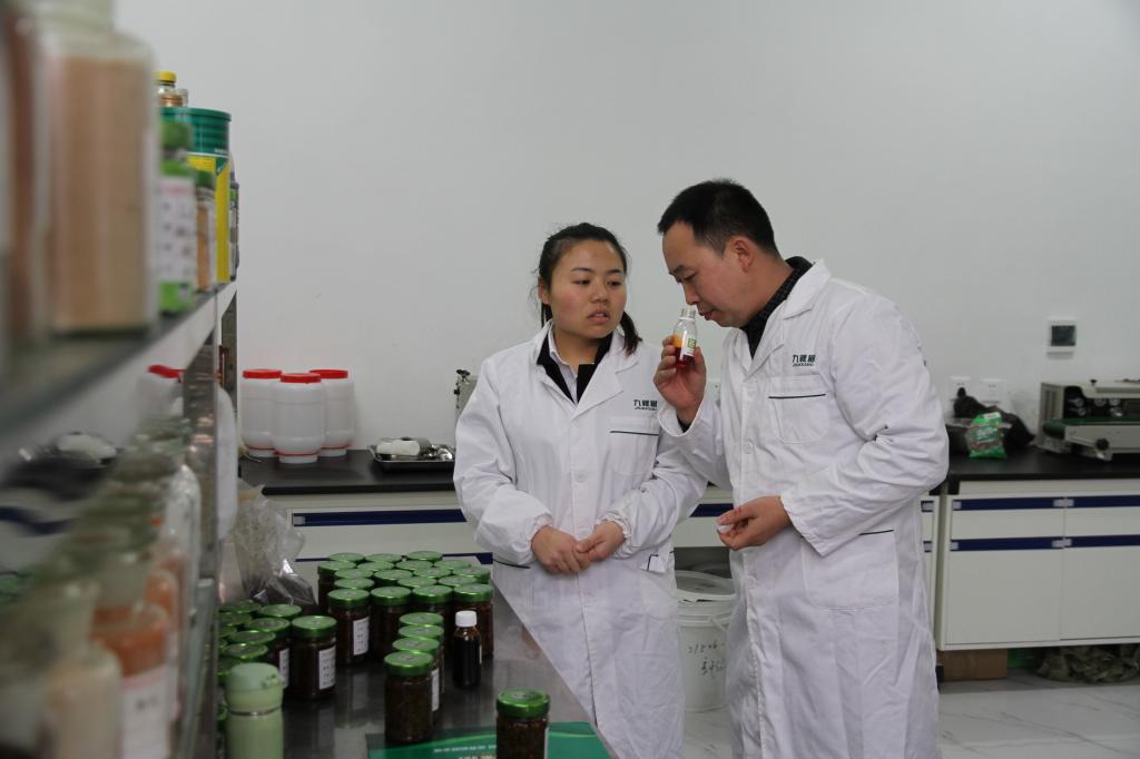 正在河南九棵树实业有限公司实验室作实验的郭卫芸博士(右一)