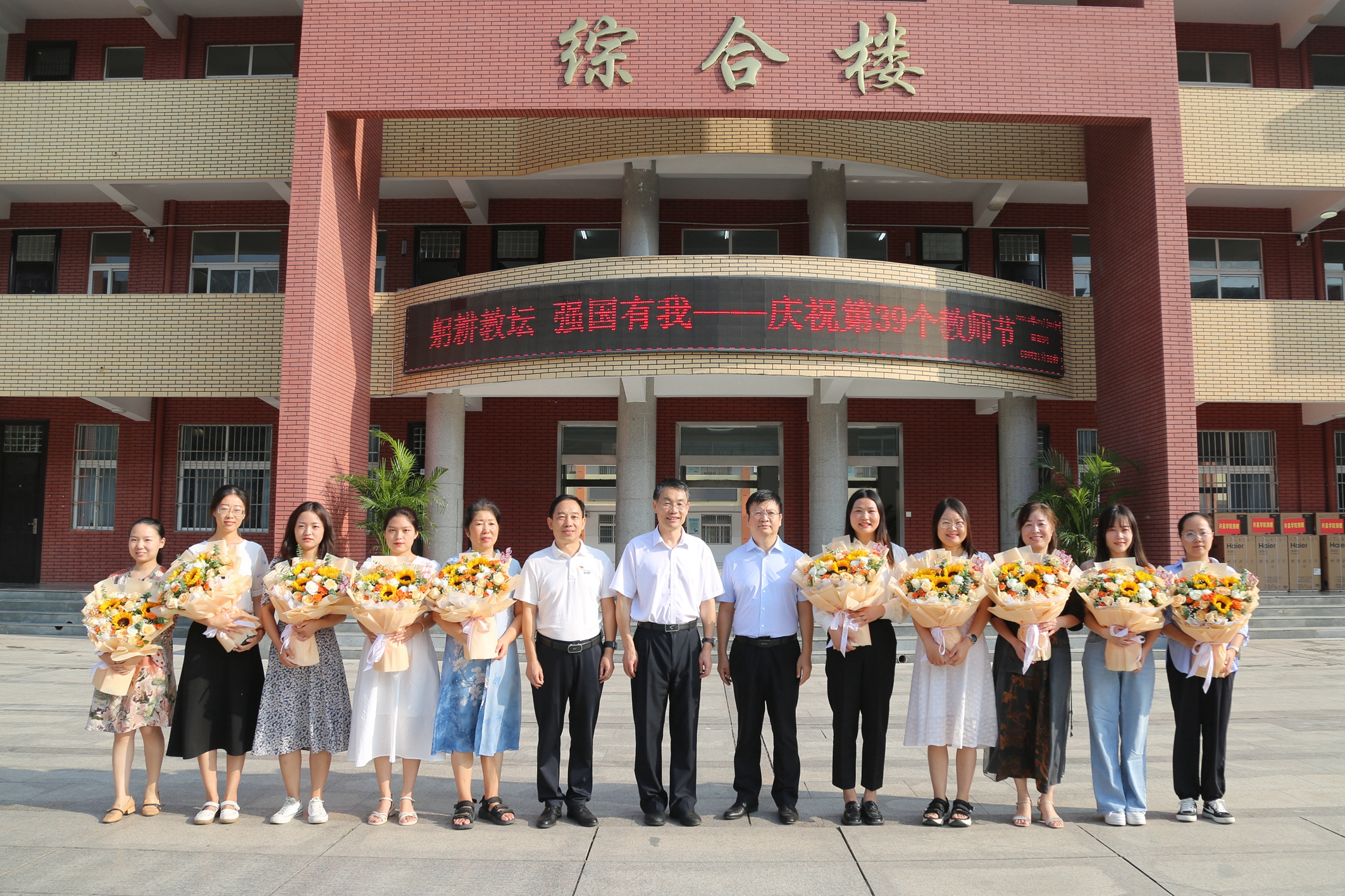 郑直一行实地走访了学校教学楼、艺体馆建设工地、运动场,详细了解校园环境设施、教育教学情况、发展规划等。郑直代表许昌学院向附属中学全体教职员工致以节日的问候和诚挚的祝福,为优秀教师代表献上鲜花,并向学校捐赠了电脑、桌椅板凳等物资。