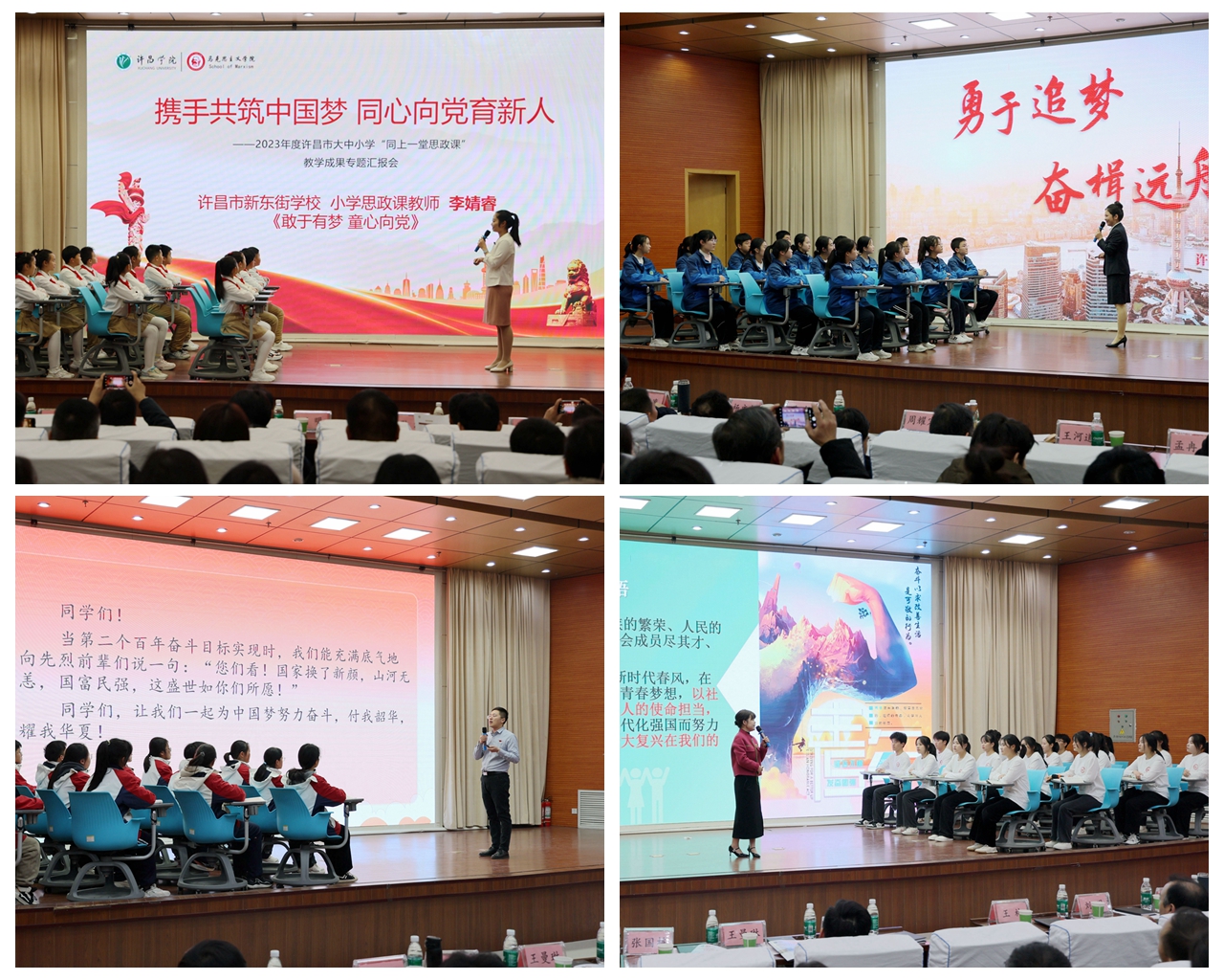 在教学展示环节,许昌市新东街小学思政课教师李婧睿、许昌实验中学思政课教师苏醒、许昌高级中学思政课教师崔小飞、许昌学院思政课教师慕旗娟四位老师围绕本次活动主题,分别以《敢于有梦童心向党》《勇于追梦奋楫远航》《勤于圆梦挺膺担当》《同心筑梦实干兴邦》为题,进行了不同学段的教学成果汇报。