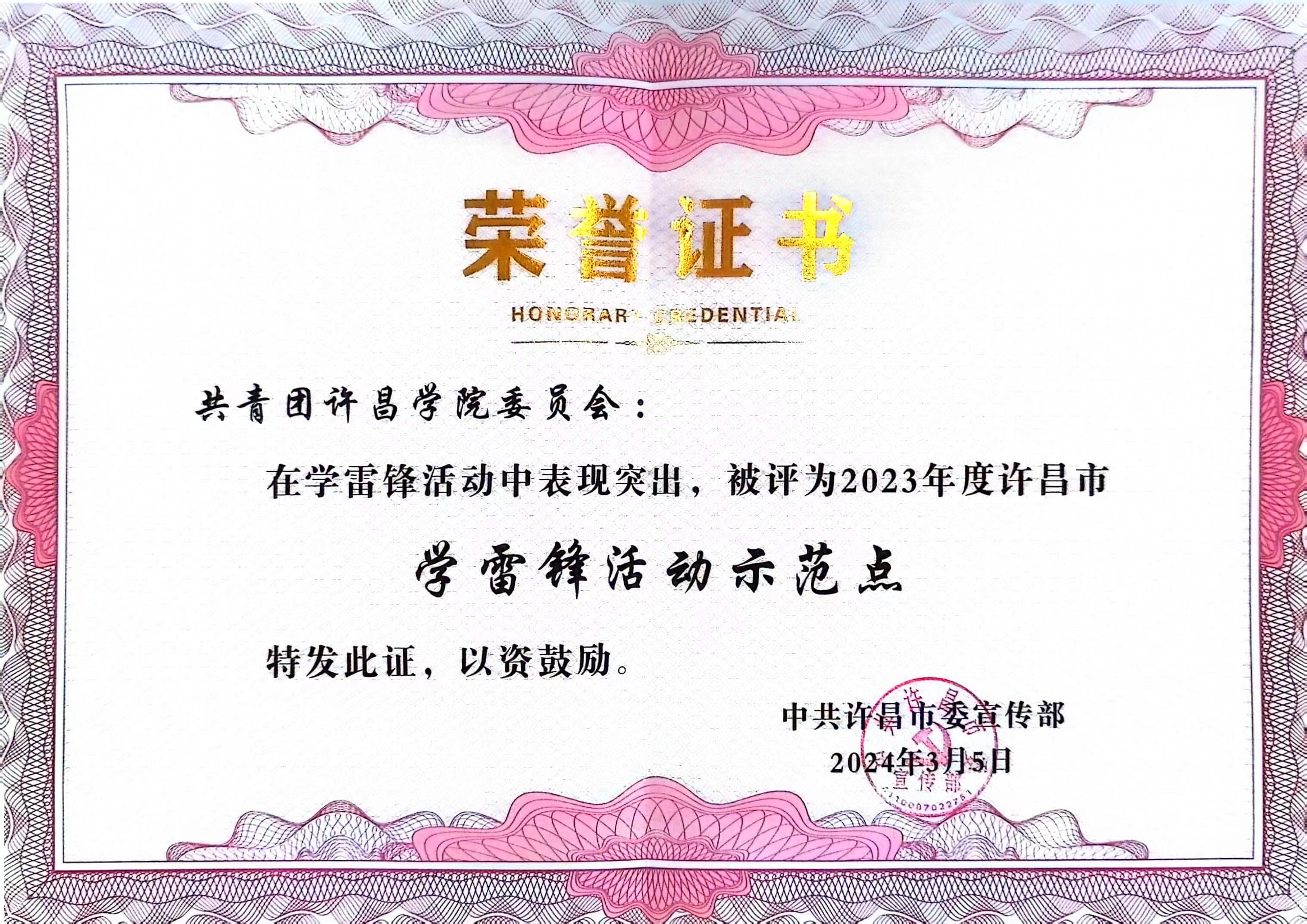 近日,中共许昌市委宣传部发布《关于命名2023年度许昌市学雷锋活动示范点和岗位学雷锋标兵的通知》,共青团许昌学院委员会被评为2023年度许昌市学雷锋活动示范点。