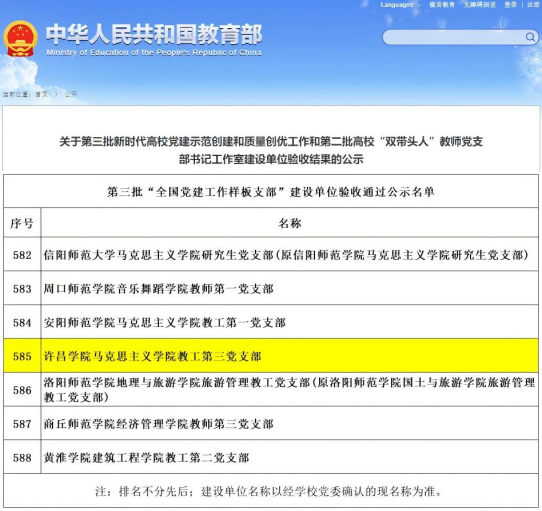 近日,教育部公布了第三批新时代高校党建示范创建和质量创优工作结果,我校马克思主义学院教工第三党支部顺利通过“全国党建工作样板支部”验收。