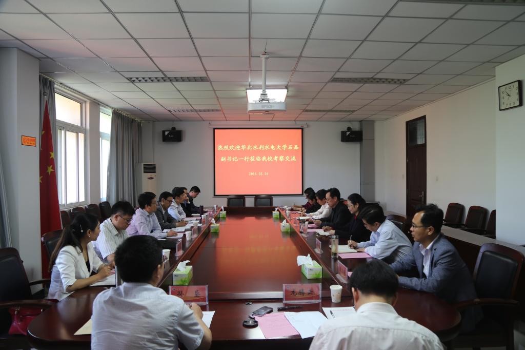 5月16日,华北水利水电大学党委副书记石品带领考察团一行9人来我校考察交流。院长赵继红、党委副书记马超会见了来访客人,并与客人开展了座谈交流。党委办公室主任潘春彩、党委组织部部长谭水木、党委宣传部部长冯晓民等也参加了交流活动。