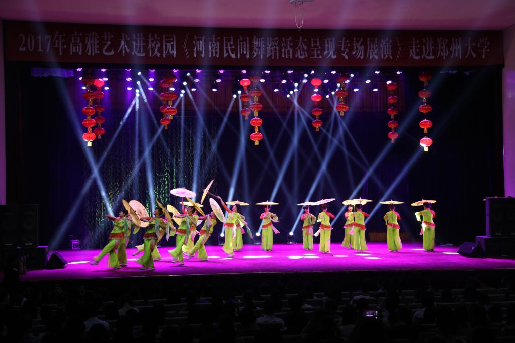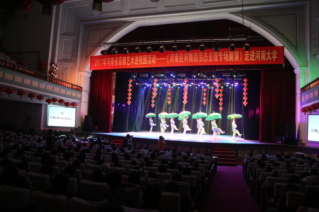 光影流转,弦歌相传。6月9日、13日,由河南省教育厅、文化厅、财政厅主办,我校承办的2017年“高雅艺术进校园——河南民间舞蹈活态呈现”分别在河南大学(明伦校区)大礼堂、郑州大学(南校区)学习堂精彩展演。省教育厅副巡视员李金川、郑州大学党委书记牛书成、副书记李兴成、郑州大学副校长韩国河,河南大学副校长张宝明和我校领导赵继红、马超、孙海等领导嘉宾出席观看表演,与两校师生共享艺术盛宴。