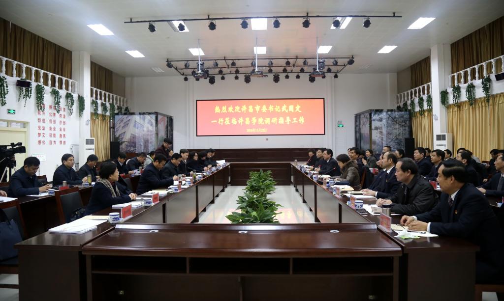 11月22日、23日,许昌市委书记武国定到我校调研并为我校师生作题为《许昌的昨天、今天和明天》的专题报告。市委常委、常务副市长石迎军,市委常委、市委秘书长王堃,副市长秦春梅陪同调研。院长赵继红等全体校级领导干部、全体中层干部、教授、博士、二级学院系主任、教研室主任、学生代表等参与调研座谈活动,并聆听了精彩报告。