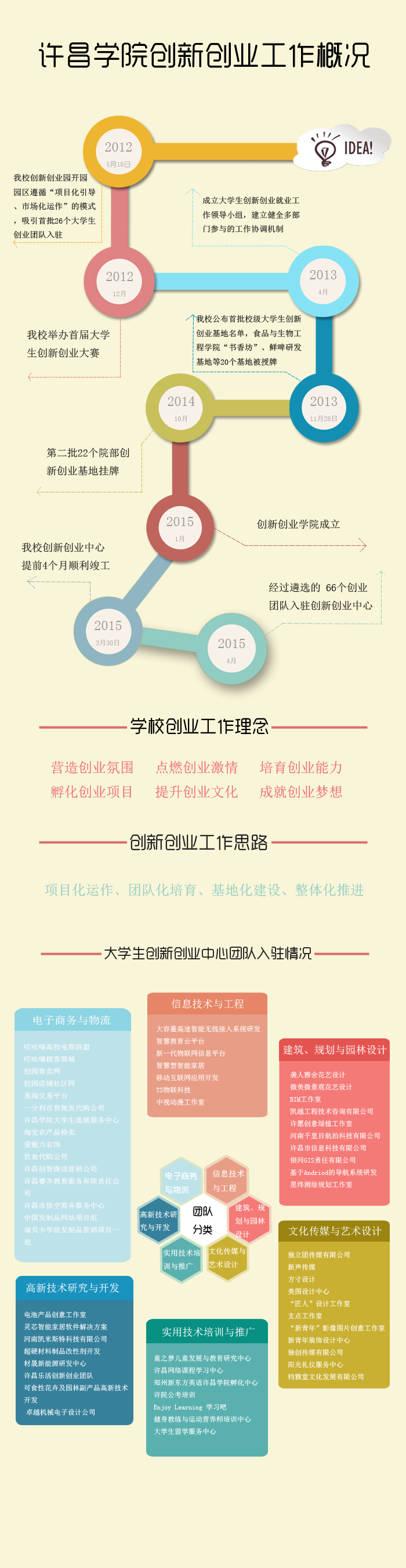 长期以来,许昌学院都以提高大学生创新创业能力作为创新创业工作的目标,项目化运作、团队化培育、基地化建设、整体化推进,通过进一步深化教学模式和课程体系改革、广泛开展创新创业实践活动、推动大学生创新创业基地建设、强化大学生创新创业指导与服务等手段,努力推动创新创业教育融入人才培养全过程。