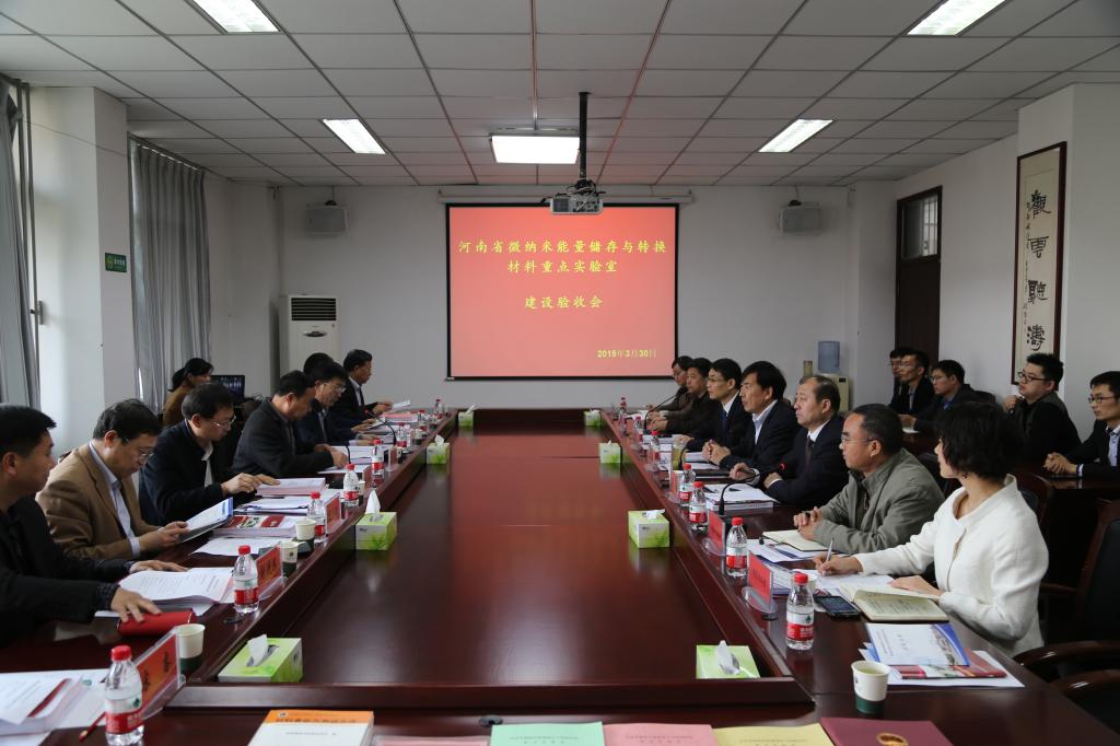 下午,依托我校建设的河南省“微纳米能量储存与转换材料”重点实验室建设验收会议在我校办公楼第一会议室举行。实验室建设验收由河南省科技厅基础研究处组织,省科技厅基础研究处处长郭遂臣、正处级调研员胡根生,副院长郑直、崔斌等领导出席了会议,院办、科研处、校地合作办公室、实验室与设备管理处等相关职能部门负责人及省重点实验室成员代表参加了会议。验收会议由胡根生调研员主持。