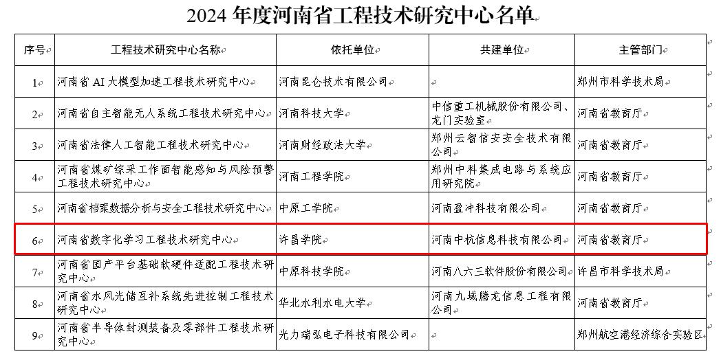 1月9日,河南省科技厅发布了《关于认定建设2024年度河南省工程技术研究中心的通知》(豫科实〔2025〕1号),我校申报的河南省数字化学习工程技术研究中心成功获批立项。