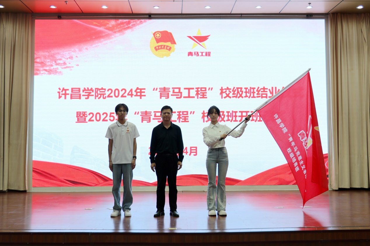 4月15日下午,我校在图书馆学术报告厅举办2024年“青马工程”校级班结业仪式暨2025年“青马工程”校级班开班仪式。校党委副书记、工会主席梁予昉出席仪式并为2025年校青马班授旗。