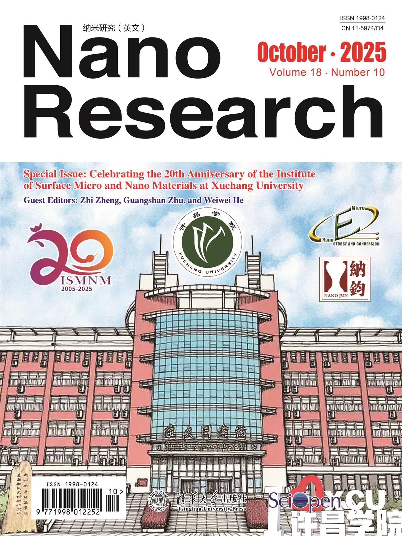 近日,国际知名学术期刊《纳米研究》(Nano Research)推出 “庆祝许昌学院表面微纳米材料研究所成立20周年”主题纪念专刊(第18卷第10期)。专刊收录了96 篇论文(含综述和研究性文章),作者来自中国、澳大利亚、加拿大、美国以及欧洲等全球100多个高校和研究机构,内容涵盖微纳米材料、纳米酶、光催化、电催化、新能源材料、生物医用纳米材料等多个前沿方向,集中展示该领域的最新研究成果。该专刊由郑直教授、朱广山教授、何伟伟教授担任客座编辑,并以“表面微纳米材料:许昌学院二十年的创新、合作与转化”为题撰写编者按。