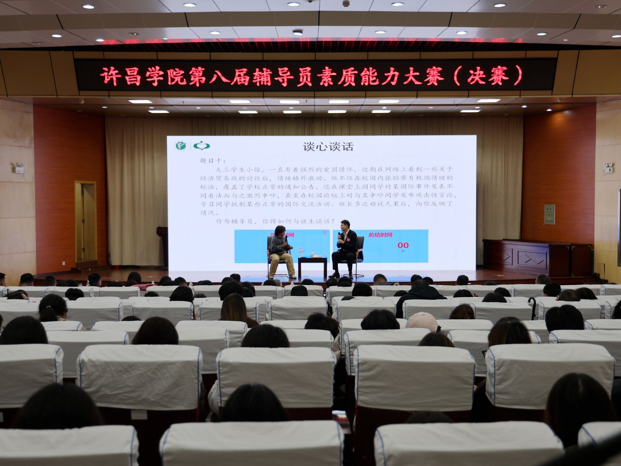 决赛谈心谈话环节以“情景再现、真人沟通”的方式进行面对面交流,主要考察辅导员对学生成长成才规律的把握程度、对谈话核心的理解,以及对学生思想引领、日常管理、学风建设、资助育人、心理危机干预和就业、创业指导等方面的教育引导能力等。经过激烈角逐,文史与传媒学院鲁自轩、医学院涂乾坤和江坤获得一等奖;国际教育学院贾依航等7人获得二等奖;食品与药学院刘艺芳等8人获得优秀奖,文史与传媒学院、教育学院、电气工程学院和医学院等4个单位获得优秀组织奖。