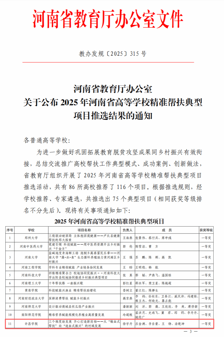 近日,河南省教育厅发布《关于公布2025年河南省高等学校精准帮扶典型项目推选结果的通知》(教办发规〔2025〕315号),我校申报的《三个维度助发展 齐心打造新岗杨——从“输血式帮扶”向“造血式振兴”的村域发展》项目荣获2025年全省高校精准帮扶典型项目一等奖。这是我校继2023年、2024年之后第三次在此项目中获奖。
