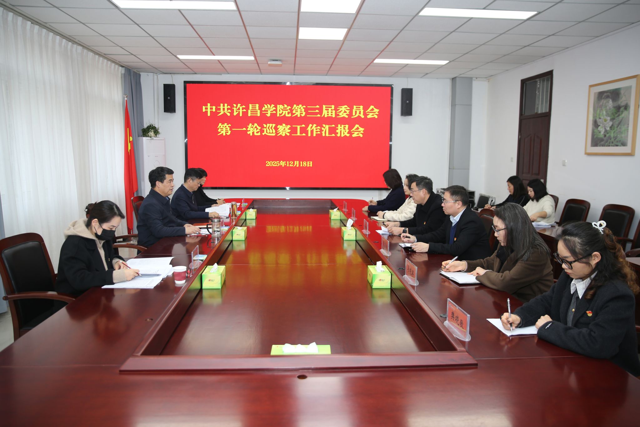 12月18日下午,我校在办公楼第四会议室召开三届党委第一轮巡察工作汇报会。校党委书记、党委巡察工作领导小组组长刘荣增主持会议并讲话。党委巡察工作领导小组成员、党委四个巡察组成员、党委巡察办公室工作人员参加会议。